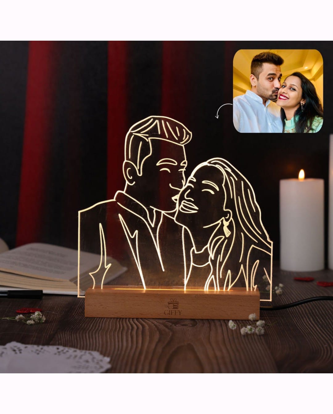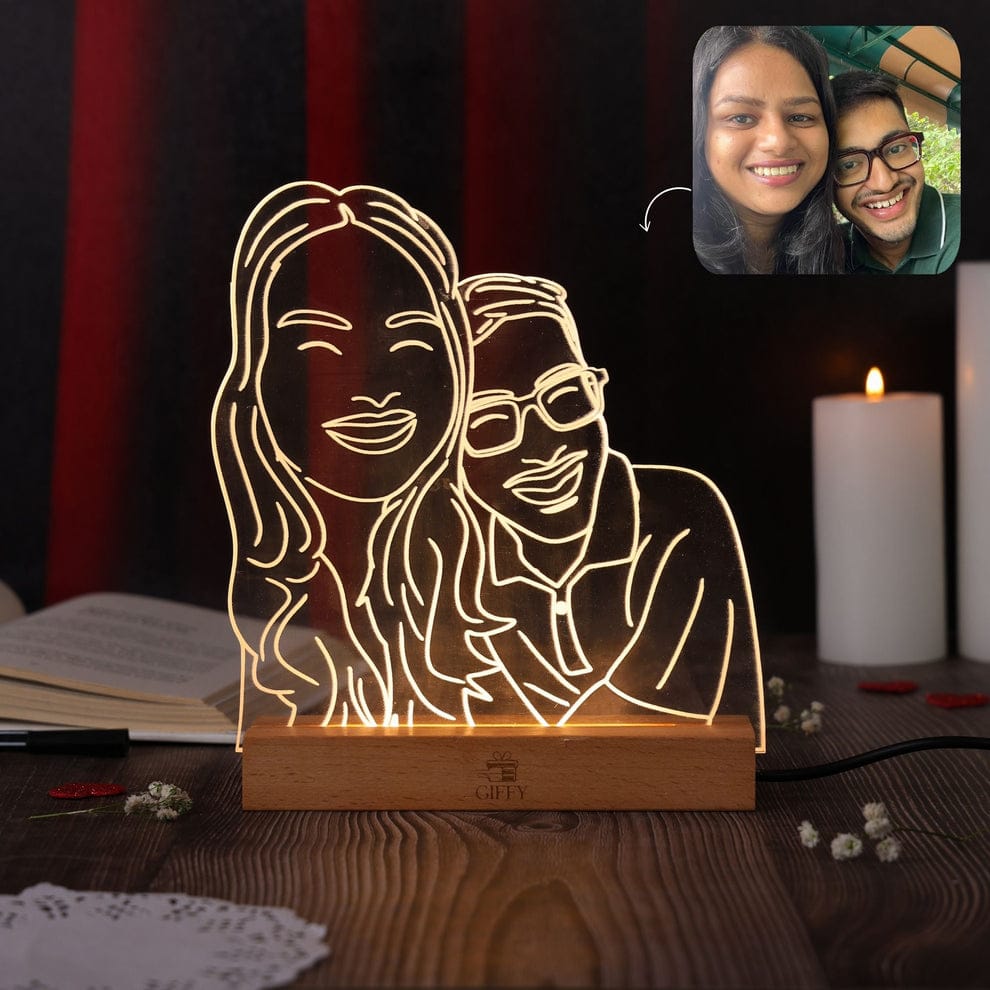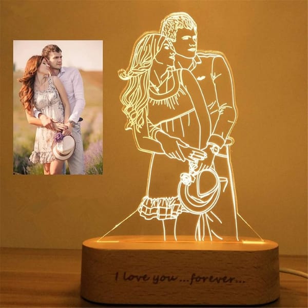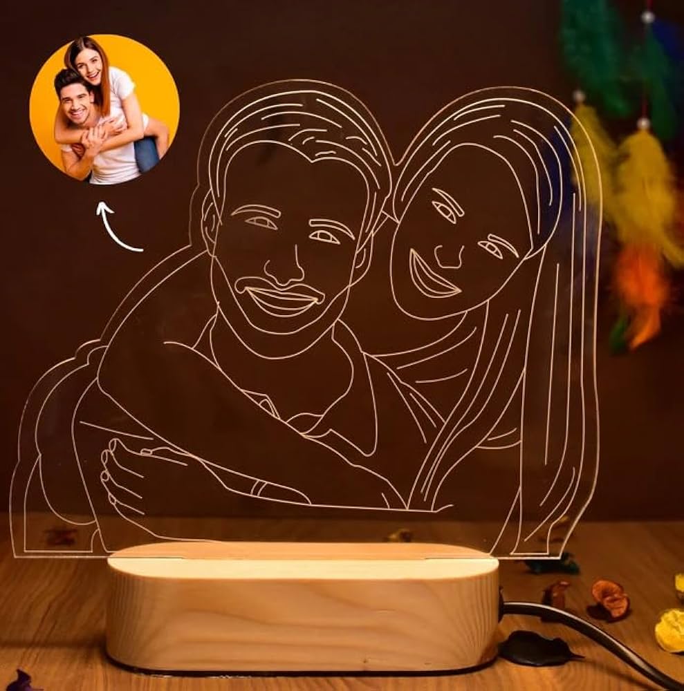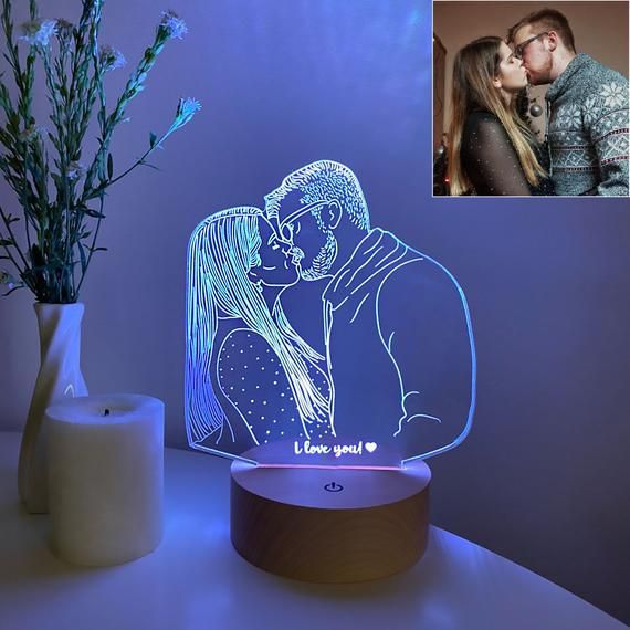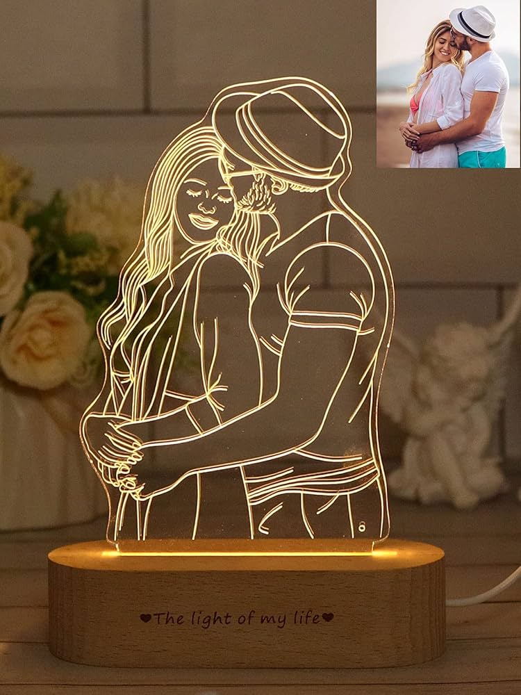 Product: A small, decorative lamp that displays a custom image engraved onto an acrylic panel.