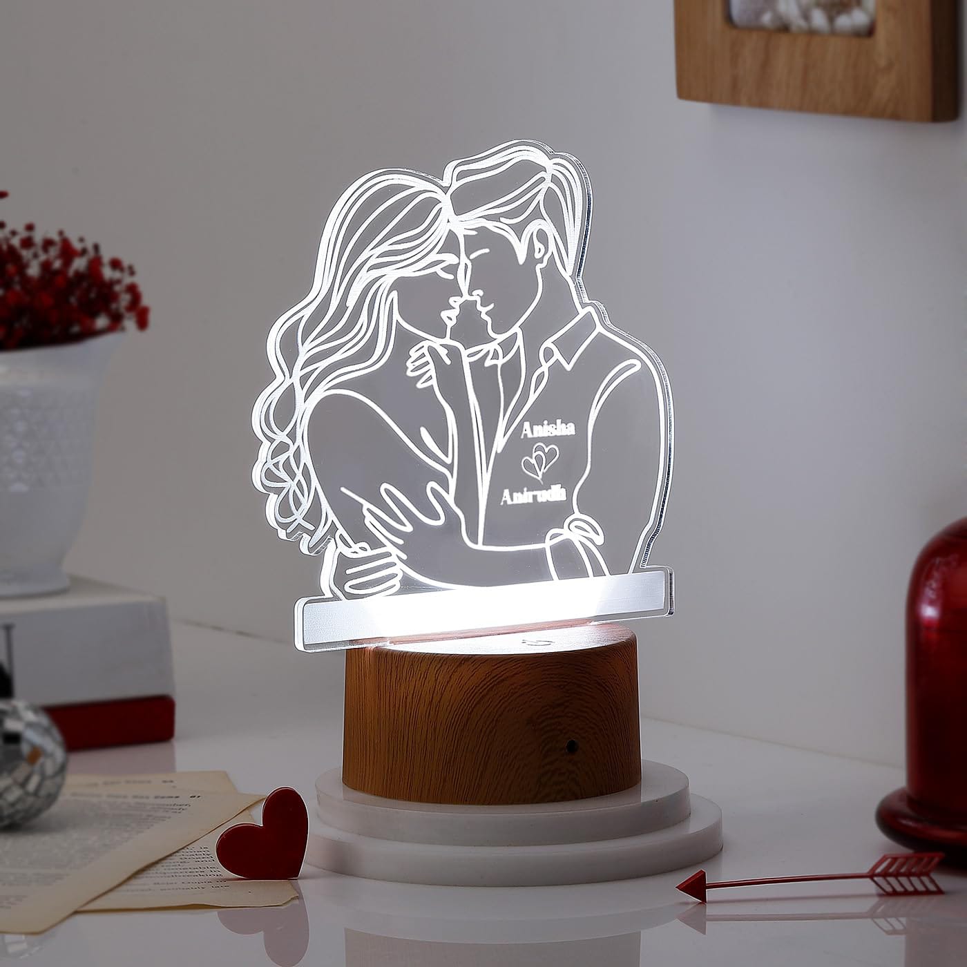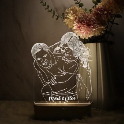 Light Effect: When turned on, the LED light in the base illuminates the etched lines, making the personalized artwork glow softly.