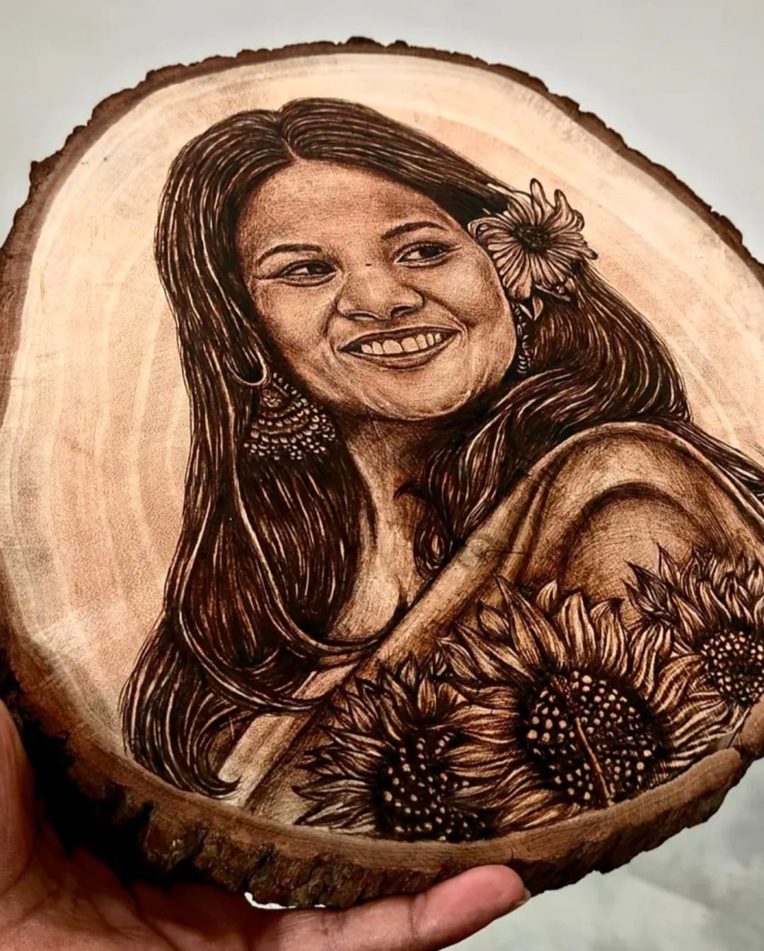 The use of varied burning temperatures creates realistic shadows and highlights, making the subject look almost three-dimensional. Stunning depth achieved through heat.